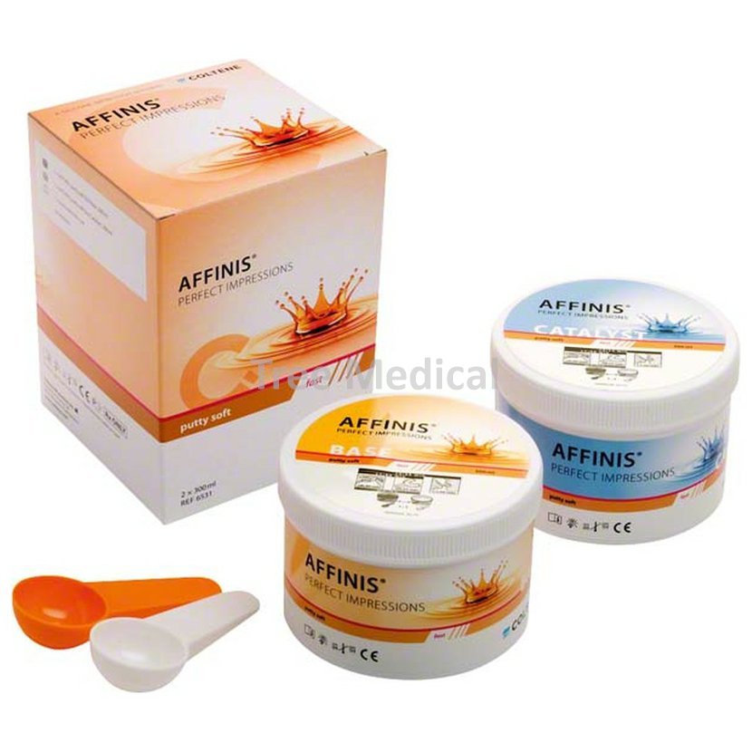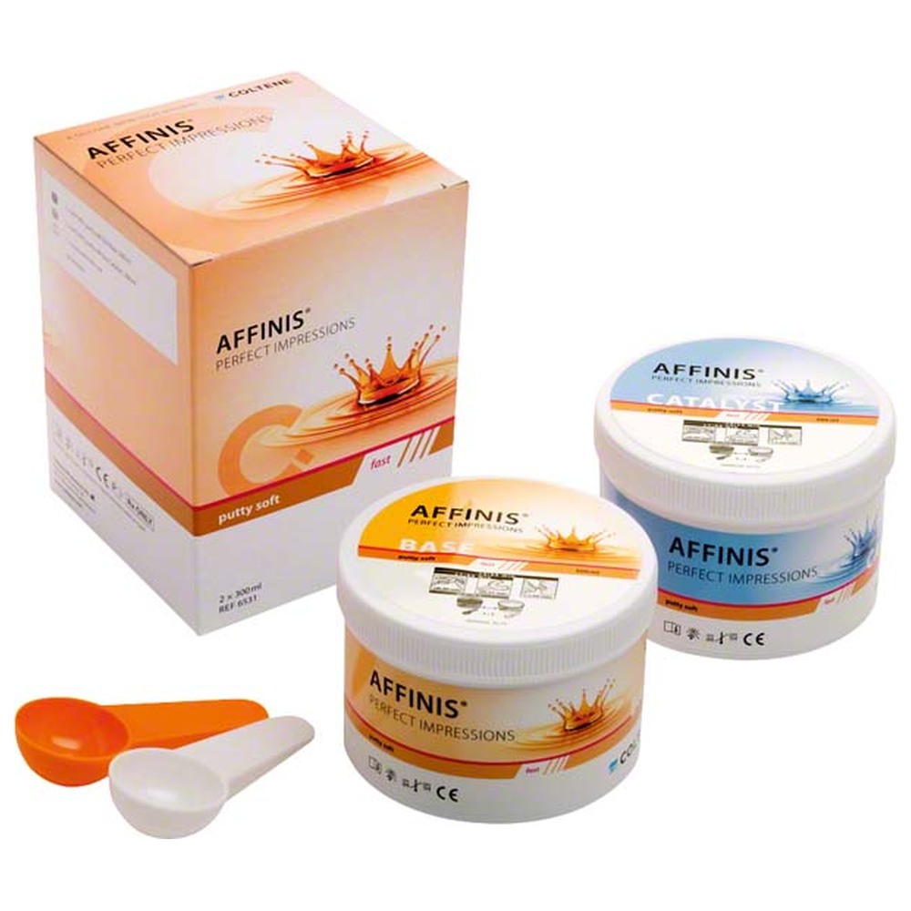Affinis Putty je obzvláště hebký a rychle namíchatelný A-silikonový otiskovací materiál, který se může ideálně použít pro všechny otiskovací techniky. Super měkká konzistence, lehké a hladké namíchání, homogenní směs v méně než 25 s. Hladká konzistence pro ideální stavbu otisku. Schopnost otisku jako u heavy body, žádné bublinky a slisování. Rychlá doba vytvrzení, krátká doba prodlení v ústech (2,5 min). Korekční otisk je možný ve 3 min. Balení 2 x 300 ml.