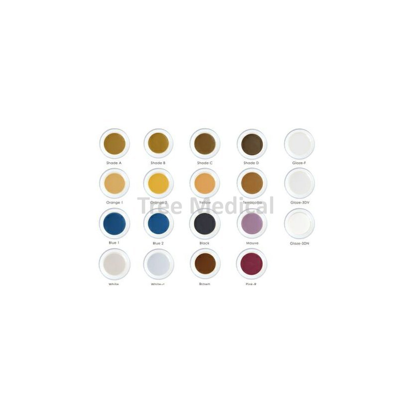Doplňková 2D barvička na dobarvení CAD/CAM prací ze zirkonu a keramiky. Krásná translucence, krásně imituje přirozené zuby. 2D barvy - střední viskozita, jednoduchá homogenní aplikace, barva se neroztéká. 3D barvy - vysoká plasticita, možnost upravit tvar výsledné práce nebo upravit kontaktní bod. Barvičky 2D a 3D lze míchat. Balení 4 g.