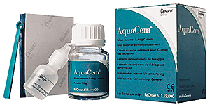 Chemicky tuhnoucí vodou ředitelný fixační skloionomerní cement. Balení 1 x 30 g prášek, odměrka na prášek, odměrka na vodu, míchací blok.