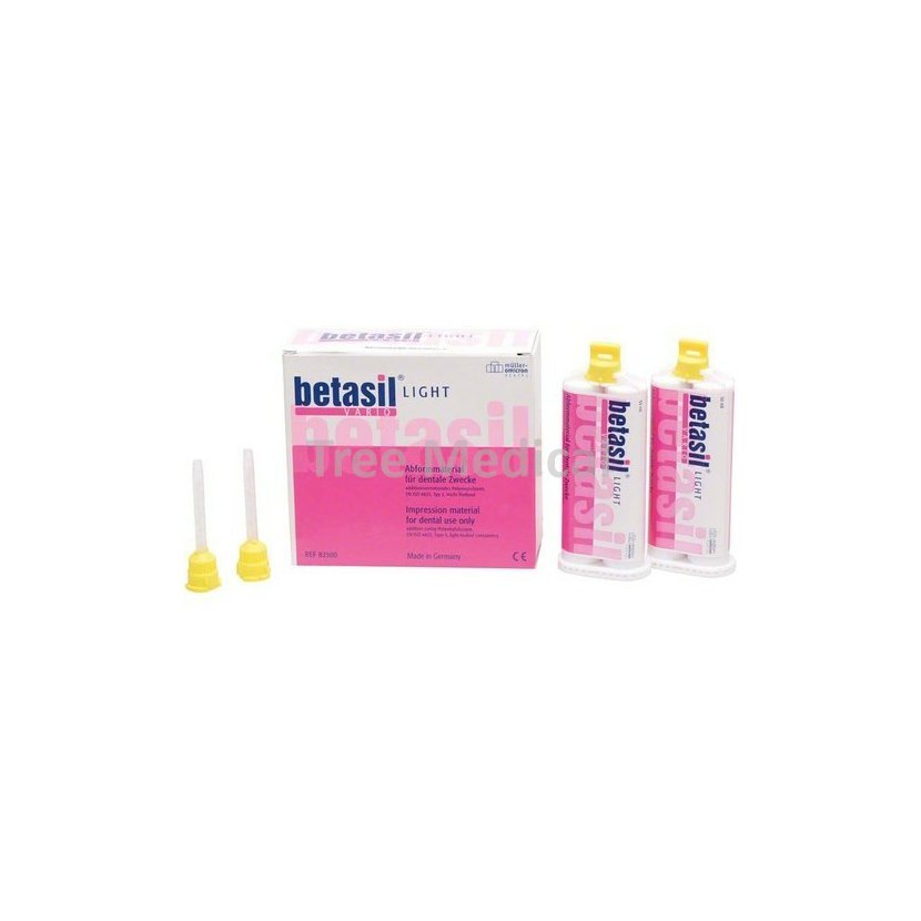 Betasil vario light je A-silikonový korekční krém řídké konzistence, extrémně jemně tekoucí, hydrofilní s optimální objemovou stabilitou pro největší detailní reprodukci. Výborná elasticita zabraňuje roztržení materiálu při vyjímání z úst. Ideální pro korekční otisky i techniku dvojího míchání.Doba zpracování až 2 min., doba tuhnutí v ústech 2 min. Barva růžová, příchuť máty. Balení 2 x 50 ml kartuše light, 12 ks míchací kanyly.