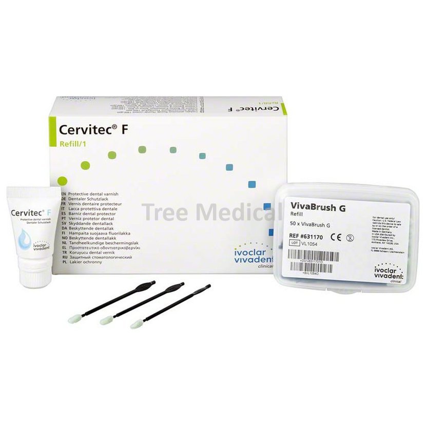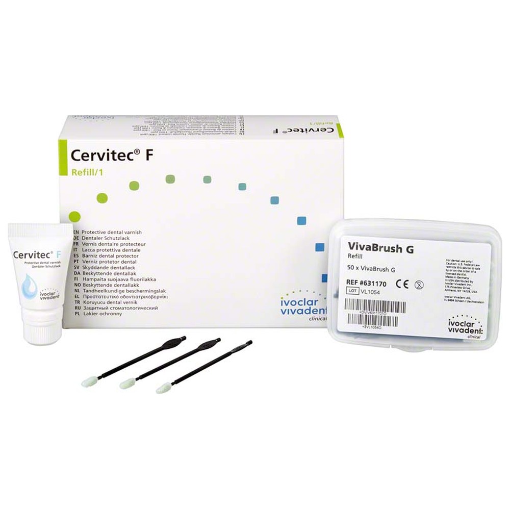 Ochranný lak s obsahem fluoridů, chlorhexidinu a CPC. Inovativní kombinace složek umožňuje fluoridaci a kontrolu bakterií v jednom kroku. Vysoká tolerance vlhkosti. Výborně zatéká do složitých povrchových struktur, poskytuje tak ohroženým oblastem důležitou ochranu. Balení 7 g tuba, 50 x VivaBrush G..