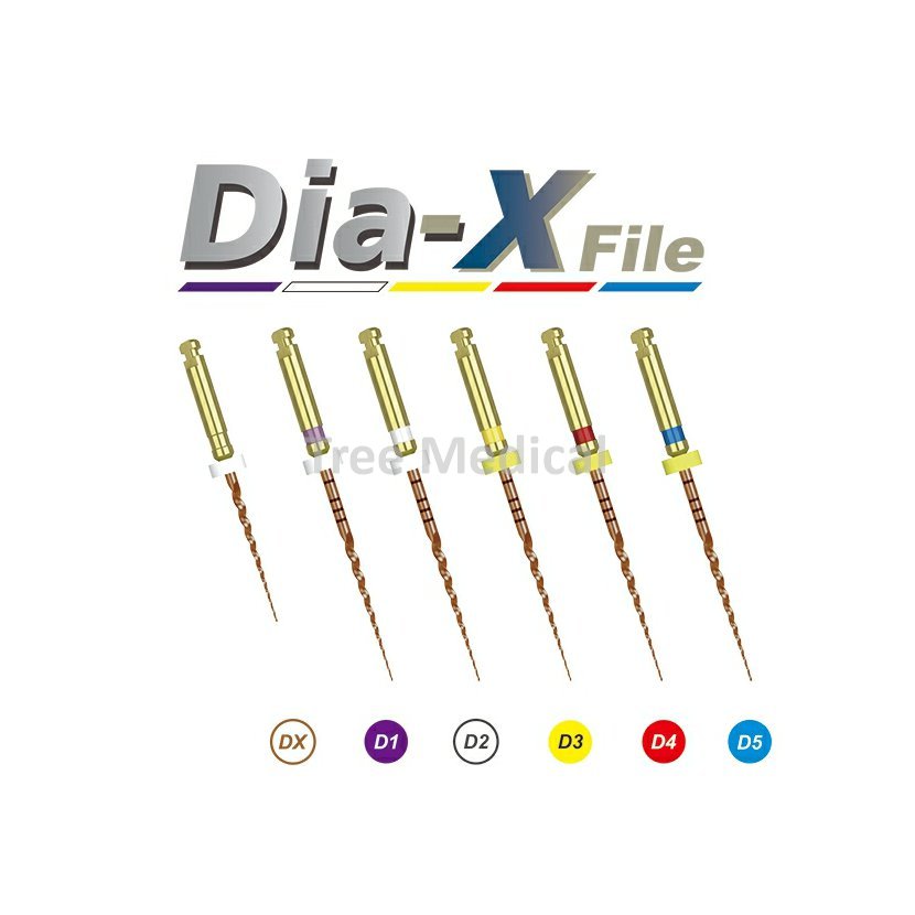 Dia-X File je nový systém výrobce Diadent pro rotační ošetření kořenových kanálku s nástroji s nikl-titanové slitiny. Nástroje jsou následně tepelně upraveny a získávají zlatou barvu. Tímto ošetřením se dosahuje mnohem větší flexibilita nástroje a tím se snižuje možnost zlomení nástroje v kořenovém kanálku. Díky vynikající flexibilitě lze možné ošetřovat i velmi zakřivené kanálky. Balení 4 ks.