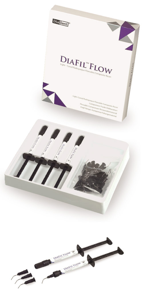 Zatékavý světlem tuhnoucí kompozitní materiál DiaFil Flow lze použít pro výplně III., V. a IV. třídy a jako podložkový materiál I. a II. třídy, rovněž také jako pečetidlo fisur. Materiál se vyznačuje minimální změnou objemu po polymeraci a je vysoce radioopákní. Nabízí dobrý poměr kvality a ceny. Barvy: A2, A3, A3,5, C2. Balení 4 x 2 g stříkačka.