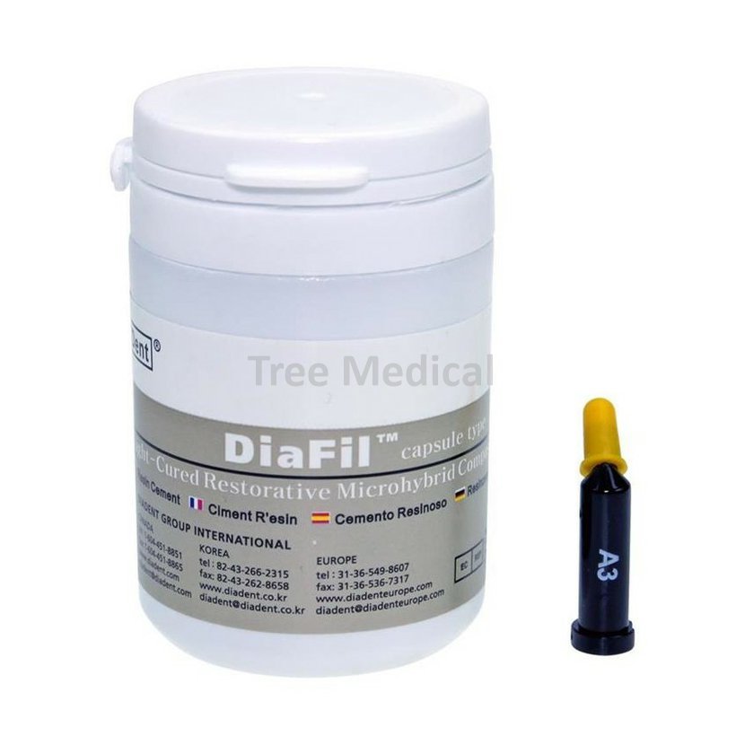 DiaFil je nanohybridní radioopákní kompozit použitelný v postranním i frontálním úseku. Minimální změna objemu při vytvrzení světlem. Vynikající mechanická odolnost v tahu a tlaku. Dobře se nanáší, nelepí se, vynikající barevná stálost. Balení 20 x 0,25 g kompule.