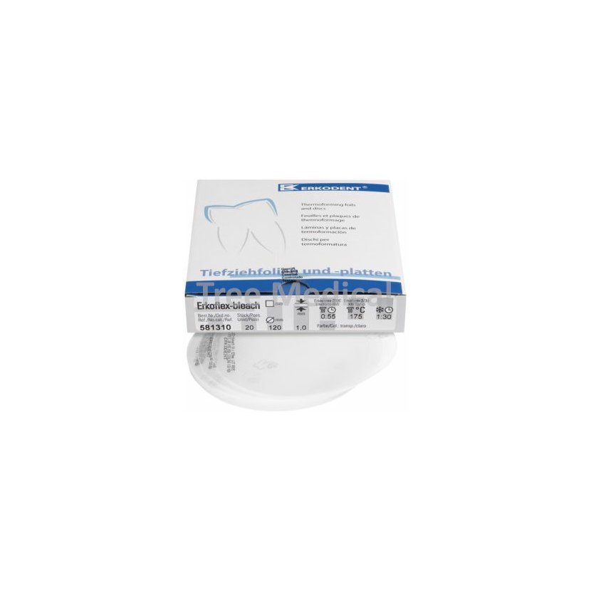Tažná fólie vyvinutá speciálně pro zhotovování bělících dlah. Tato fólie přesně vyhovuje požadavkům kladeným na tyto dlahy. Tloušťka 1,0 mm. Vhodná pro všechna hlubokotažná zařízení s průměrem 120 mm. Velmi dobře hlubokotažná. Perfektně se uzavírá. Lze ji snadno opracovávat jak nůžkami, tak také speciálními vrtáky. Balení 20 ks.