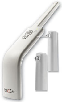 Světlem aktivovaná dezinfekce. Světlo je absorbováno speciální tekutinou, přeměněny na energii, která následně rozbíjí molekulární kyslík na atomární kyslík, který léčí na stejném principu jako ozónové přístroje. Vhodné na Endodoncii, periodoncii, léčbu periimplantitídy, gingivitidy, perikoronitídy a kazu. Žádné vedlejší účinky, bez vytváření rezistence, účinné na všechny mikroorganismy. Balení 1 x lampa FotoSan 630, nabíječka s adaptérem, 5 x 1,2 ml FotoSan Agent v stříkačkách (1 x tekutý, 2 x střední, 2 x hustý), 2 x 10 ks ochranné obaly, 5 x 10 ks koncovky (tupé 4mm, tupé 8 mm, perio krátké, Perio dlouhé, endo).