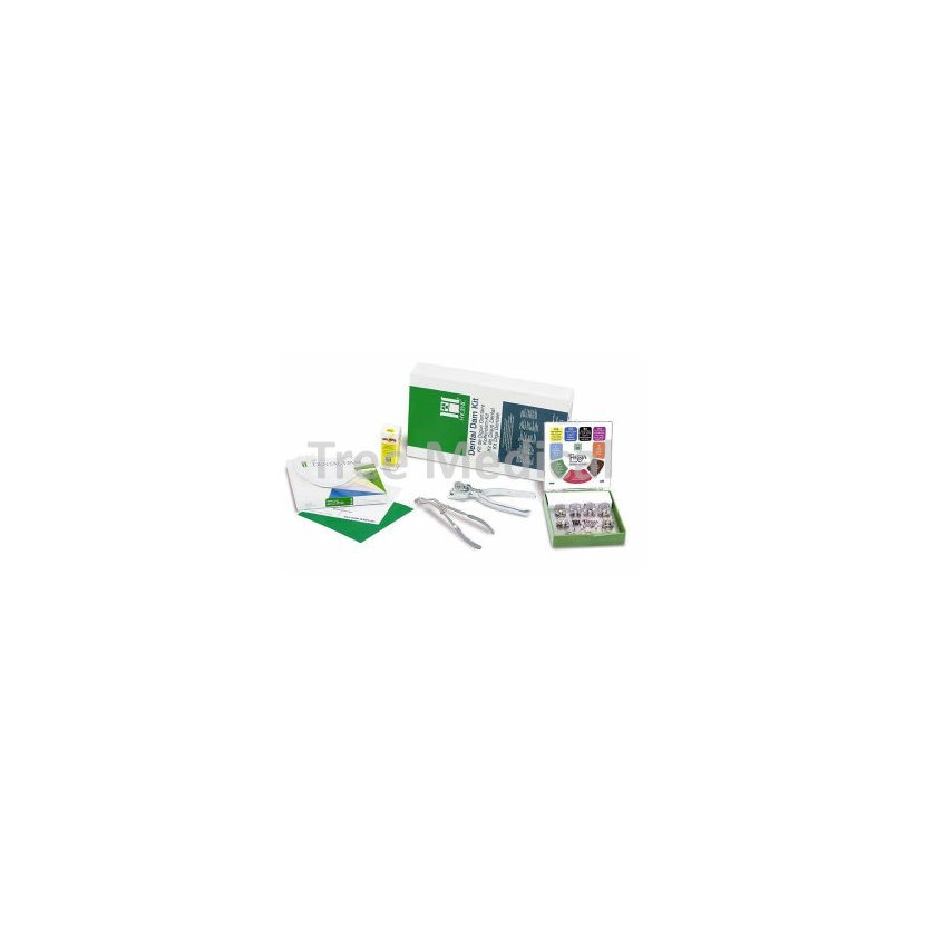 Kompletní sada kofferdamu od firmy Hygenic. Balení 1 x děrovací kleště, 1 x sponové kleště, 1 x Dental Dam green medium 36 ks s rozměry 152 x 152 mm, 1 x plastový rámeček 152 mm, 9 ks Spony Fiesta bez křidýlek, 1 x šablona 152 mm, 1 x Wedjets Cord small.