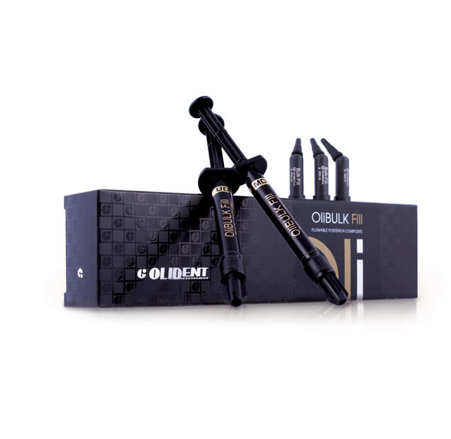 OliBulk Fill je světlem tuhnoucí, zatékavý, vysoce rentgenkontrastní (210% Al) kompozit určený pro přímou rekonstrukci v postranním úseku technikou Bulk-Fill.