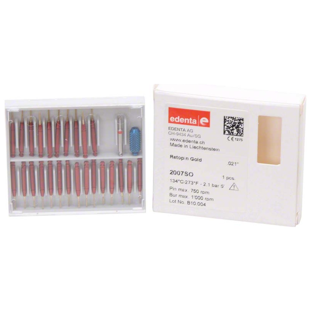 Zlacené parapulpální čepy pro fixaci amalgamových a kompozitních výplní, snadná manipulace - jedna velikost použitelná na téměř všechny indikace (0,6 x 4 mm), opakovaně použitelné mandrely, pro strojové i ruční použití. Balení 25 ks Retopin Gold s mandrely, 1 vrták, 1 zavaděč.