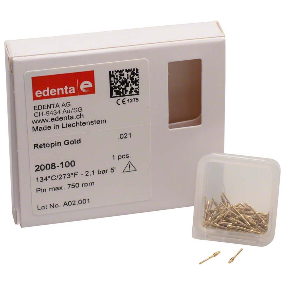 Zlacené parapulpální čepy pro fixaci amalgamových a kompozitních výplní, snadná manipulace - jedna velikost použitelná na téměř všechny indikace (0,6 x 4 mm), opakovaně použitelné mandrely, pro strojové i ruční použití. Balení 100 ks Retopin Gold bez mandrelů.