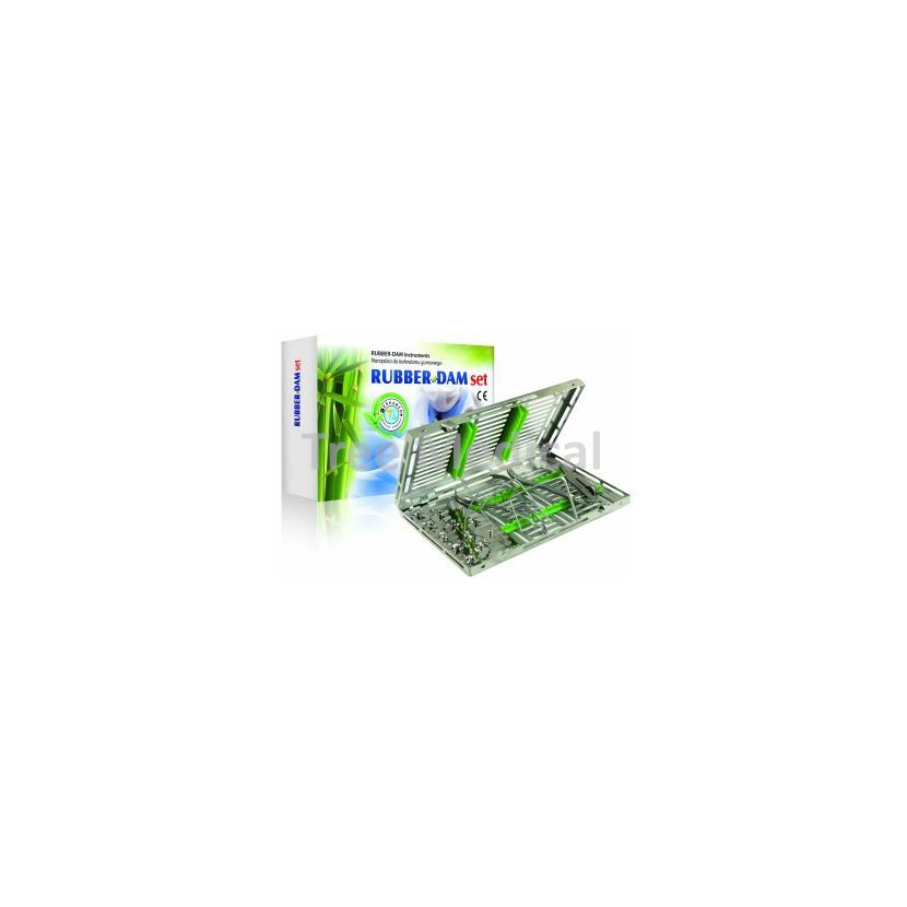 Úvodní sada kofferdamu. Balení 1 x děrovací kleště, 1 x sponové kleště, 3 x nerezové rámy, 1 x sada spon 10 ks (č. 3, 5, W8A, 12A, 13A, 210, 212, 27, 29, 00).