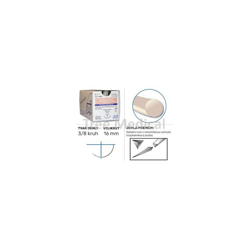 Sterilní resorbovatelné vlákno s jehlou pro šití nebo ligaturu měkkých tkání. Složení: Polyglecaprone 25 - kopolymer složený ze 75 % glycolide a 25 % E-caprolactone. 90 % pevnosti zůstává po 7 dnech. Barva fialová. Kompletní resorbce za 90 - 120 dní. Délka 75 cm. Balení 12 ks.