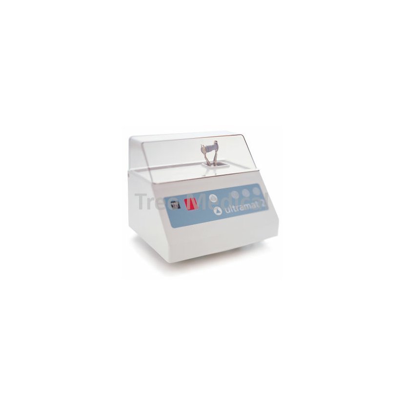 Vysokorychlostní míchací přístroj pro kapslové dentální materiály s přesným mikroprocesorem řízeným časovým spínačem a displejem pro zobrazení přednastaveného času. Tichý chod s nízkými vibracemi, jednoduché ovládání, univerzální držák, díky němuž je Ultramat 2 vhodný pro všechny druhy kapslových materiálů. Bezpečnostní spínač automaticky přeruší třepání při otevření plastového krytu. Plastový povrch nemá póry a snadno se čistí. Ultramat 2 je ekonomický přístroj s nízkou spotřebou energie. Vysoký výkon při frekvenci 4600/min,napětí 120 - 240 V a 50 nebo 60 Hz. Záruka 5 let.