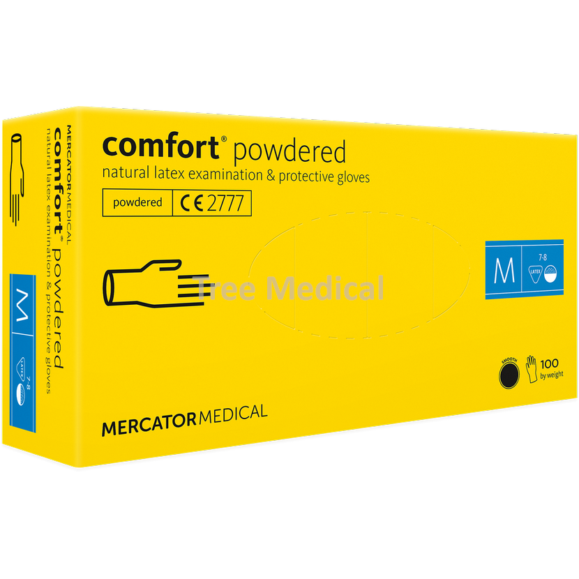 Vyšetřovací latexové rukavice Comfort. Rukavice jsou pudrované, což snižuje potivost rukou. Balení 100 ks.